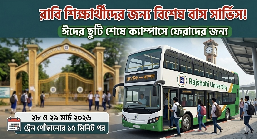 রেলপথে আসা শিক্ষার্থীদের যাতায়াত নির্বিঘ্ন করতে বিশেষ বাস ট্রিপের ব্যবস্থা করেছে বিশ্ববিদ্যালয় কর্তৃপক্ষ। আগামী ২৮ ও ২৯ মার্চ এই বিশেষ সেবা প্রদান করা হবে।